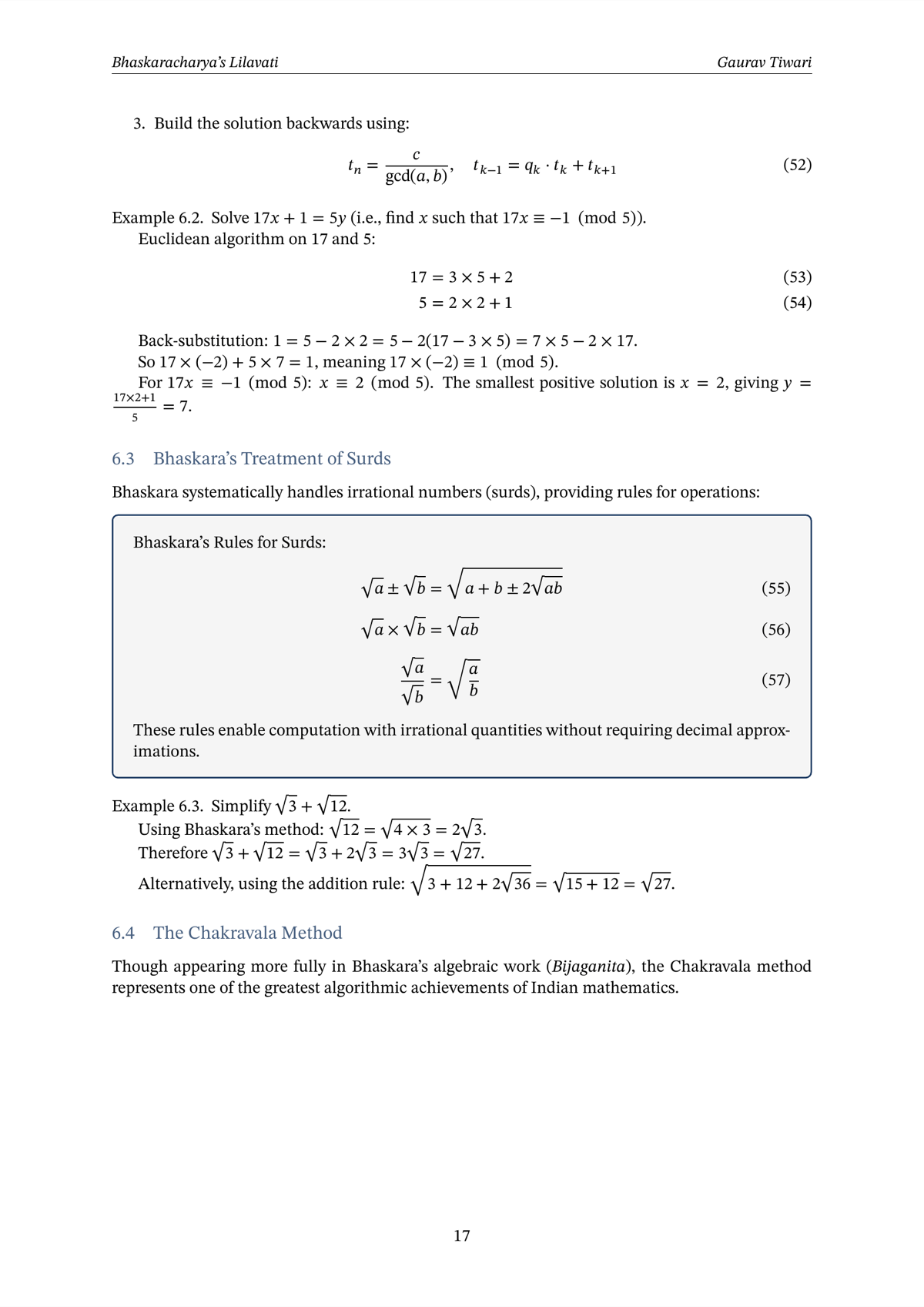 The mathematical methods section covers the Rule of Three, the Kuttaka algorithm, Bhaskara’s treatment of surds, and the Chakravala method for solving Pell’s equation, which predates European solutions by several centuries.