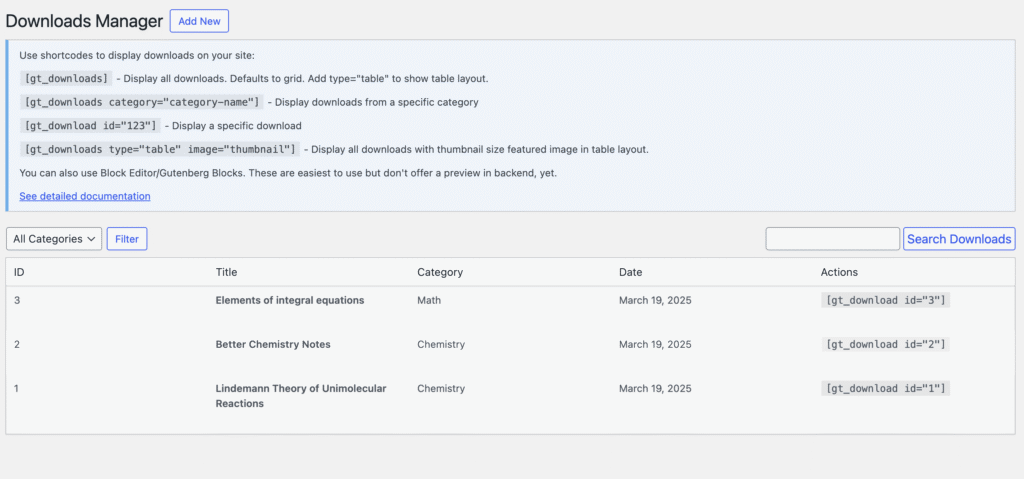 gt-downloads-managerdirectory to the/wp-content/plugins/directory - Activate the plugin through the ‘Plugins’ menu in WordPress