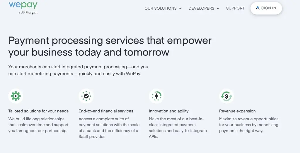 WePay, backed by JP Morgan, is designed for platform-based businesses that need a simple way to manage payments for their users. It offers fast, flexible payment solutions with minimal setup, making it ideal for service providers and marketplaces that need a tailored solution to manage customer transactions.