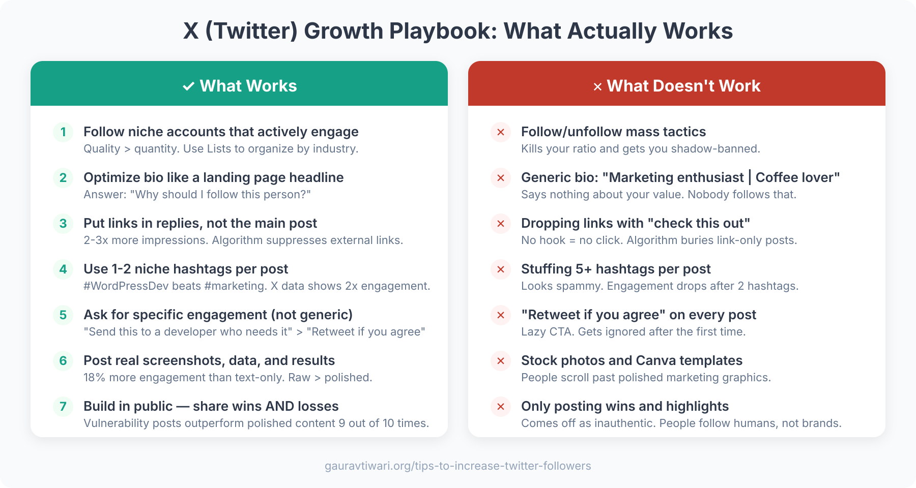 The old “follow everyone and hope they follow back” approach died years ago. X’s algorithm in 2026 rewards genuine engagement, not inflated follower counts. Following 5,000 random accounts and praying for reciprocity isn’t a strategy. It’s spam.