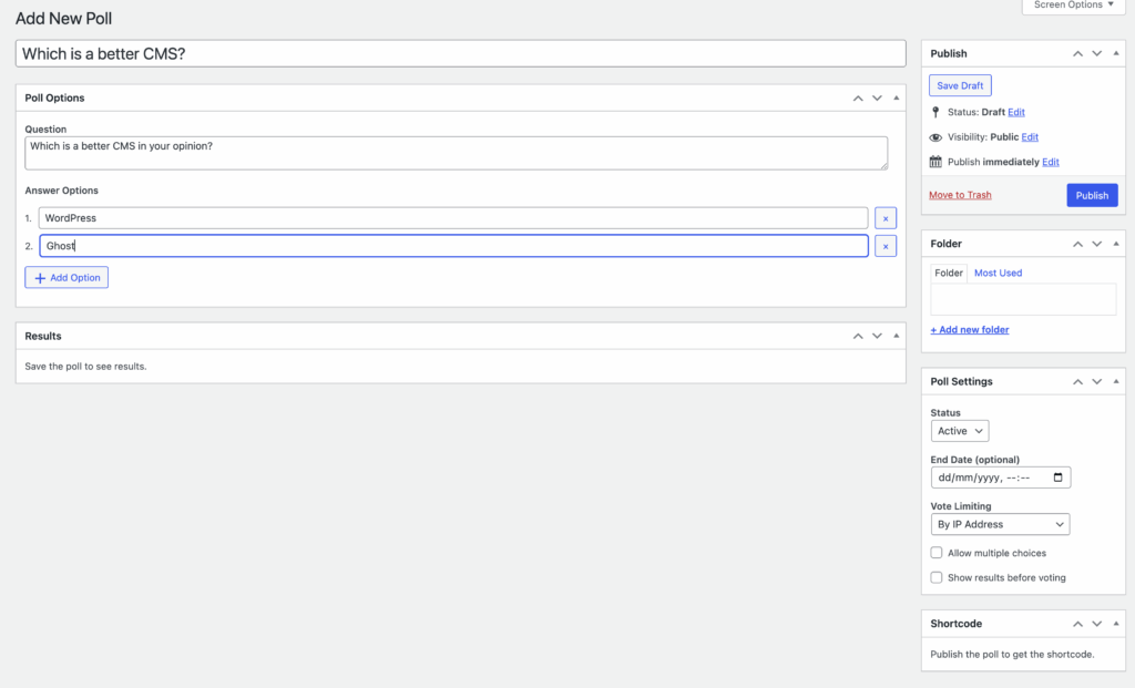Core Polls. A complete polling system with its own post type, AJAX voting, multiple-choice support, vote deduplication (by IP, user, or cookie), end dates, and live results.