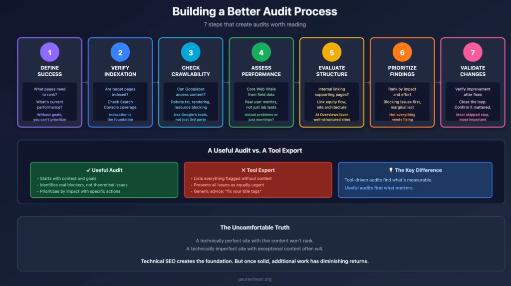 A valuable technical SEO audit differs from a tool export. It requires judgment, not just scanning. It demands prioritization, not just detection.