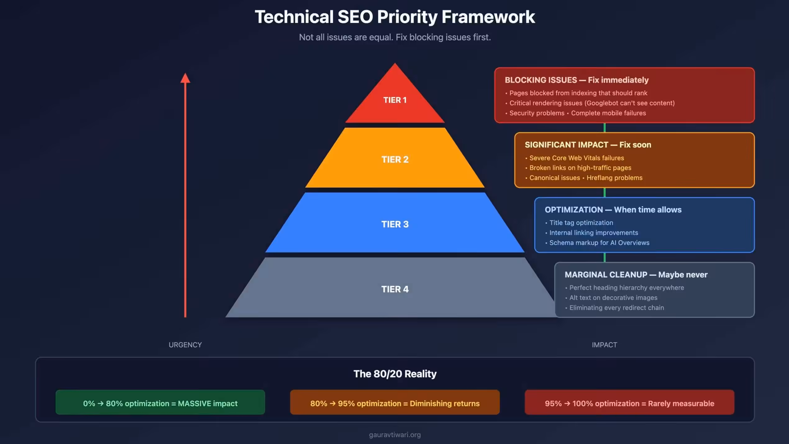 Tier 1: Blocking issues (indexation, access, security). Tier 2: Significant impact (severe CWV failures, broken links on important pages, canonical problems). Tier 3: Optimization opportunities (title tags, internal linking, schema for AI Overviews). Tier 4: Marginal cleanup (decorative alt text, redirect chains). Fix blocking issues first—nothing else matters until they’re resolved.