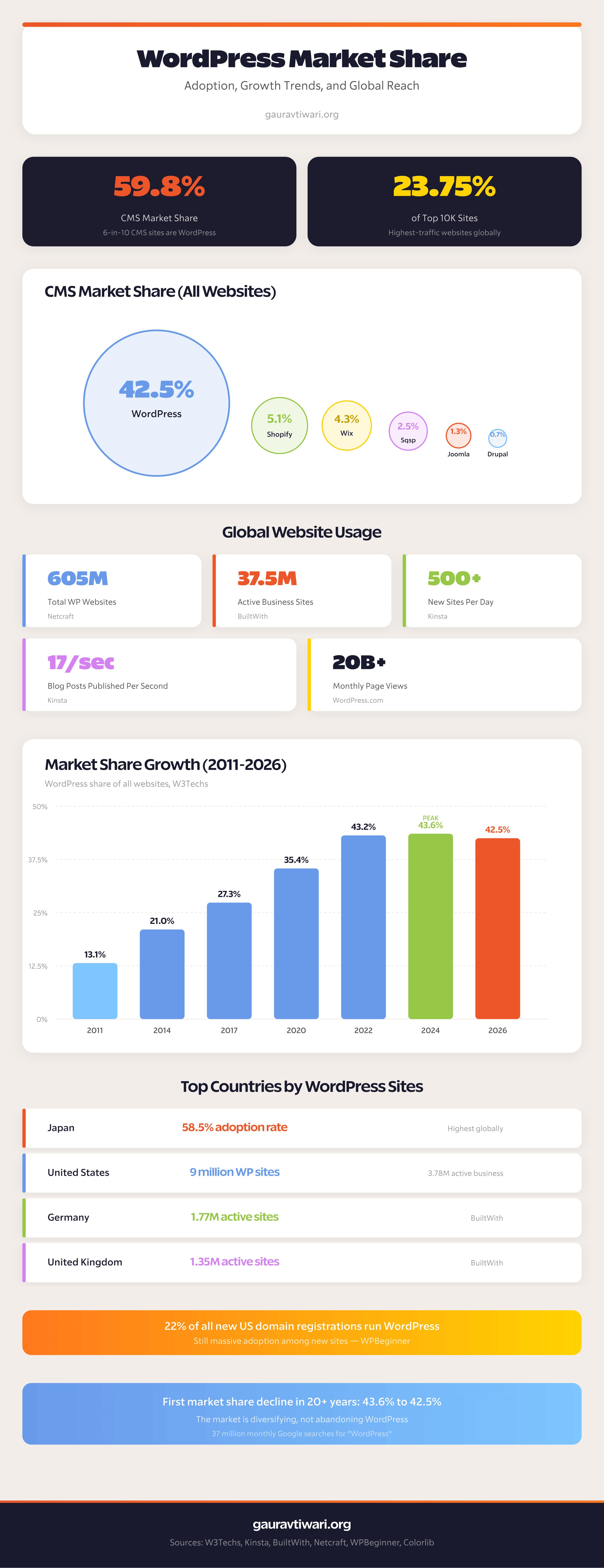 WordPress powers 42.5% of all websites globally in 2026, down from its 2024 peak of 43.6%. Here are the numbers that matter most: