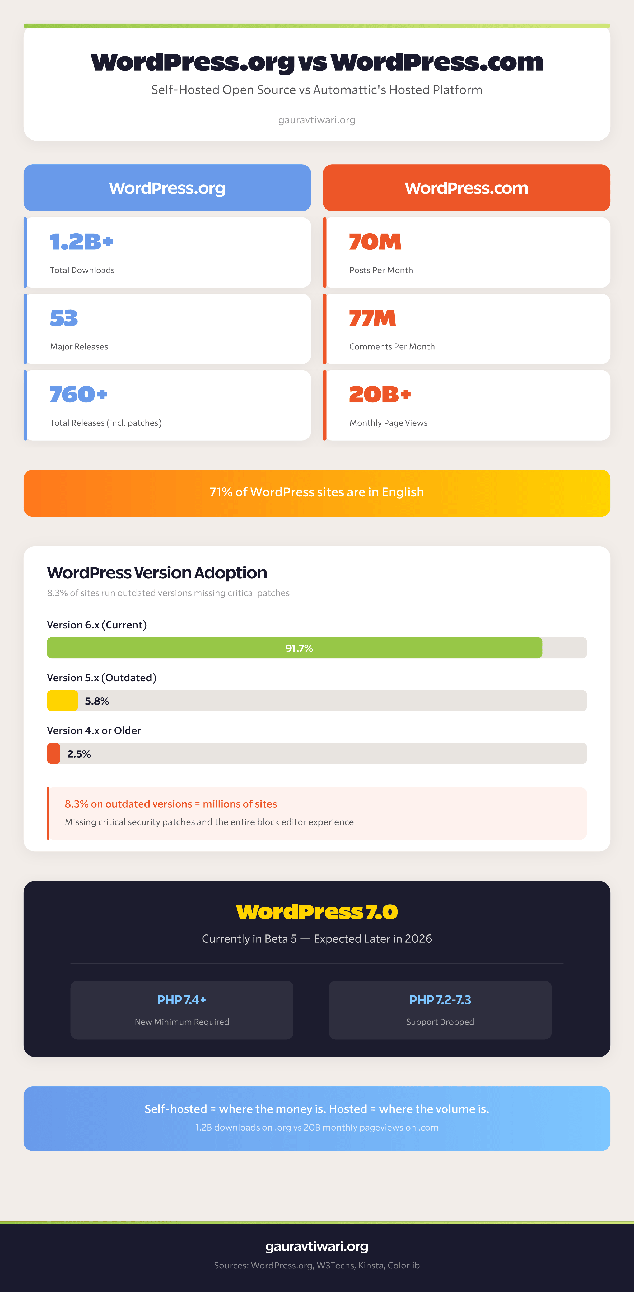 - ~30% still run end-of-life PHP 7.x (WordPress.org Stats)