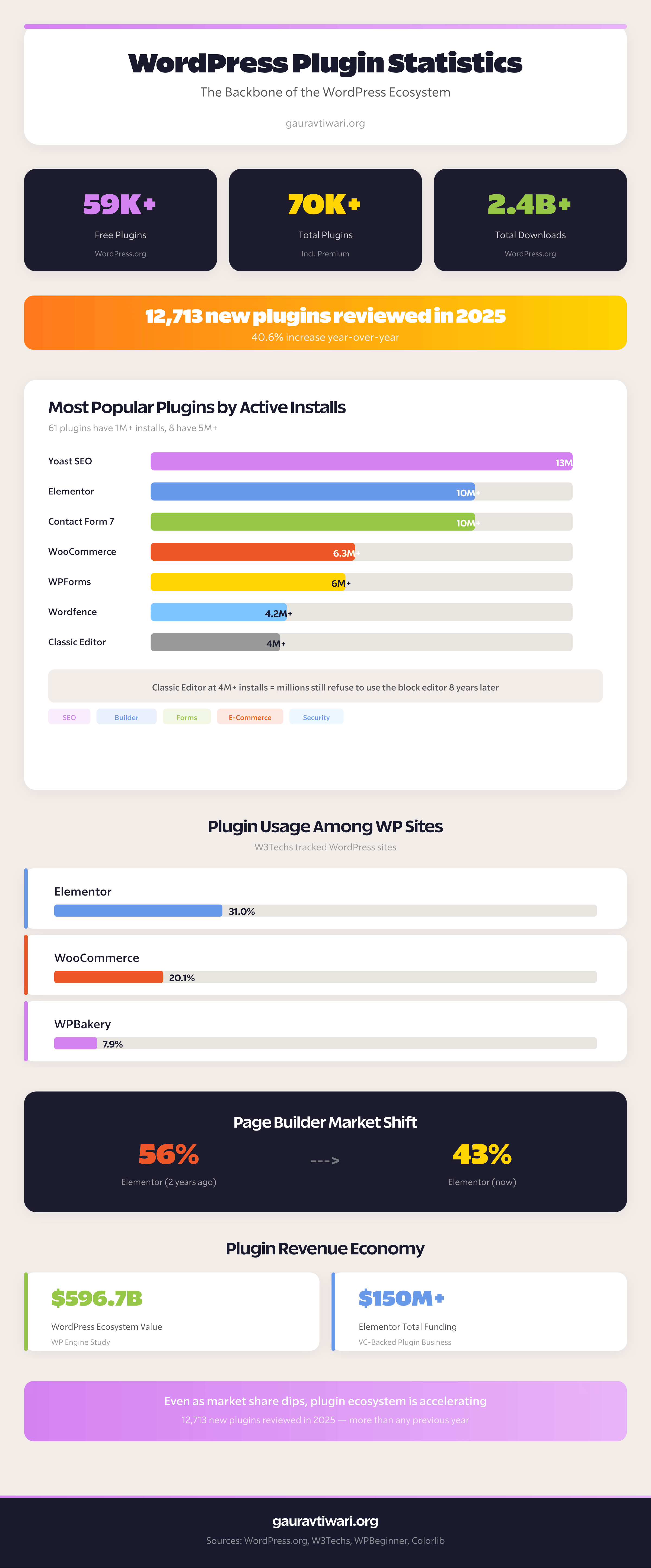 - 12,713 new plugins were reviewed in 2025, a 40.6% increase year-over-year (WordPress.org)