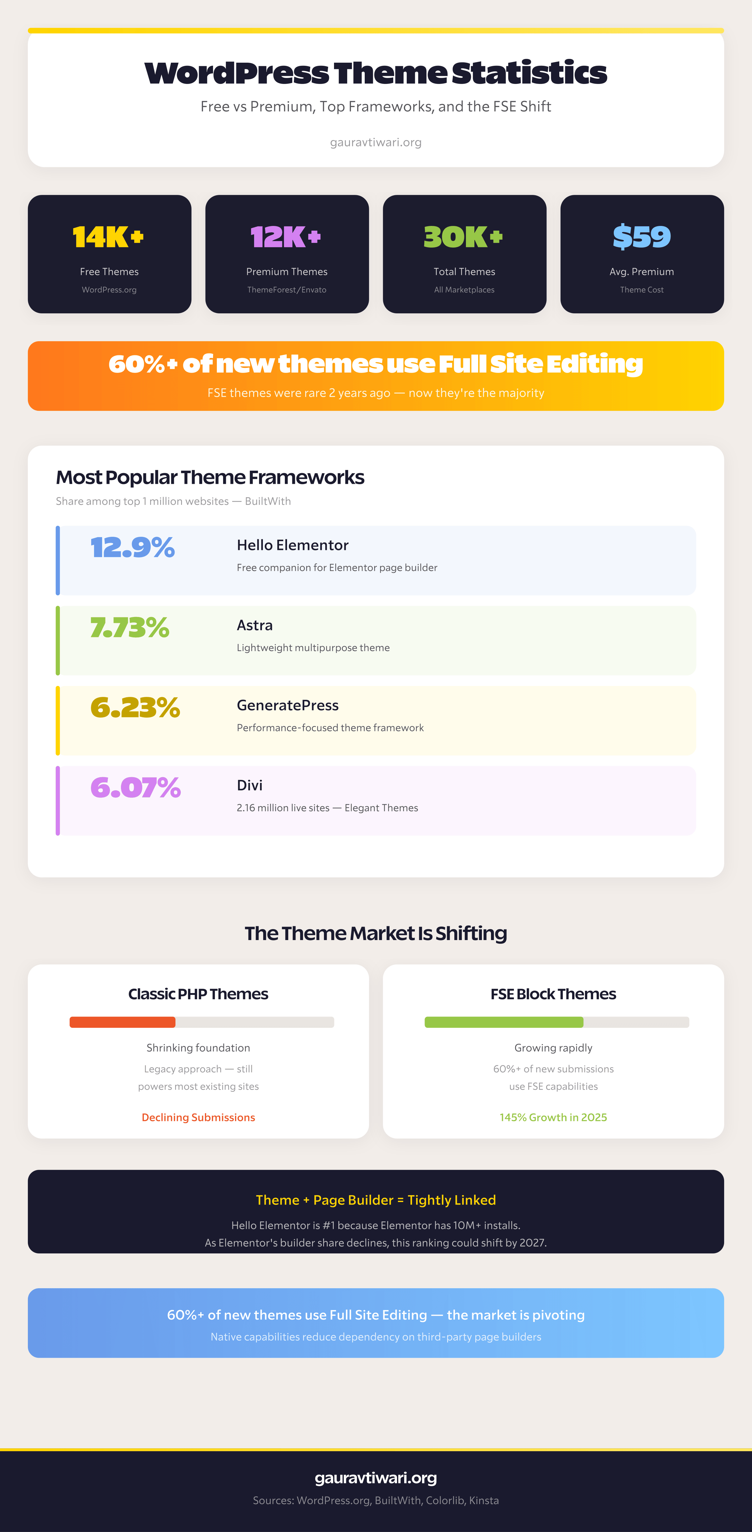 Elementor alone has 10+ million active installs with both free and premium tiers (WordPress.org). But Elementor’s page builder market share has declined from 56% to 43% over the past two years (Colorlib), as Gutenberg and newer builders like Bricks gain ground.