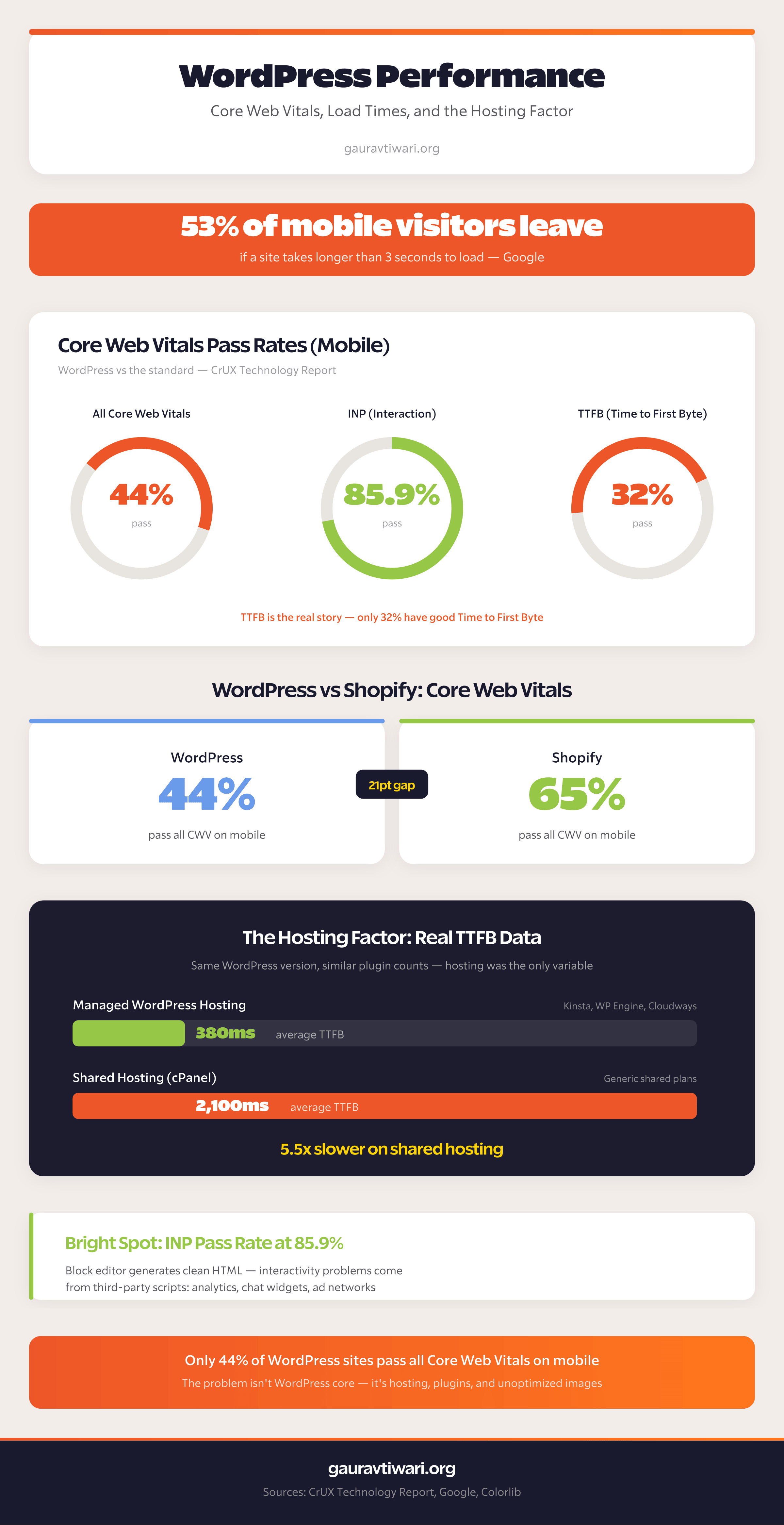- Only 44% of WordPress sites pass all Core Web Vitals on mobile (CrUX Technology Report)