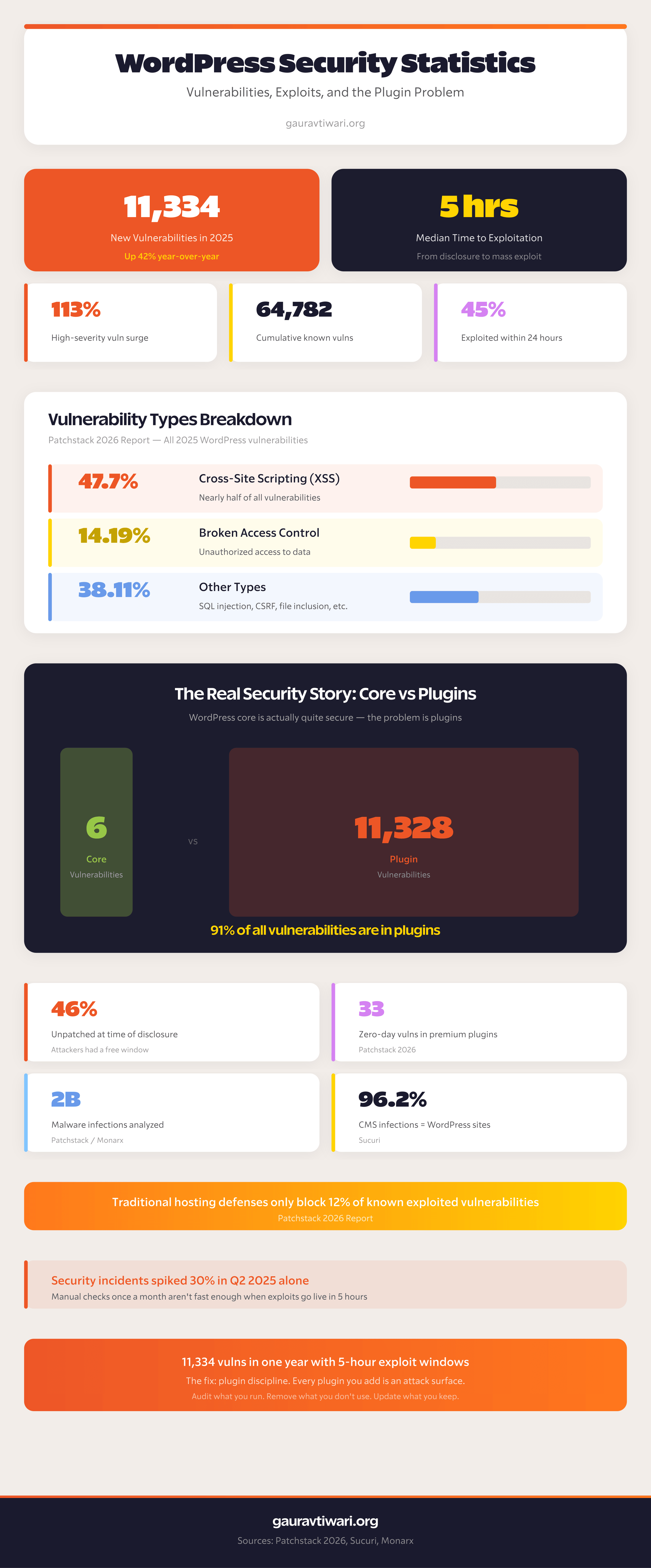 WordPress core is relatively secure, with only 6 vulnerabilities found in core during 2025. The broader ecosystem had 11,334 new vulnerabilities discovered in 2025 (up 42% year-over-year), with 91% found in plugins. The median time from disclosure to mass exploitation is just 5 hours, making regular updates critical.