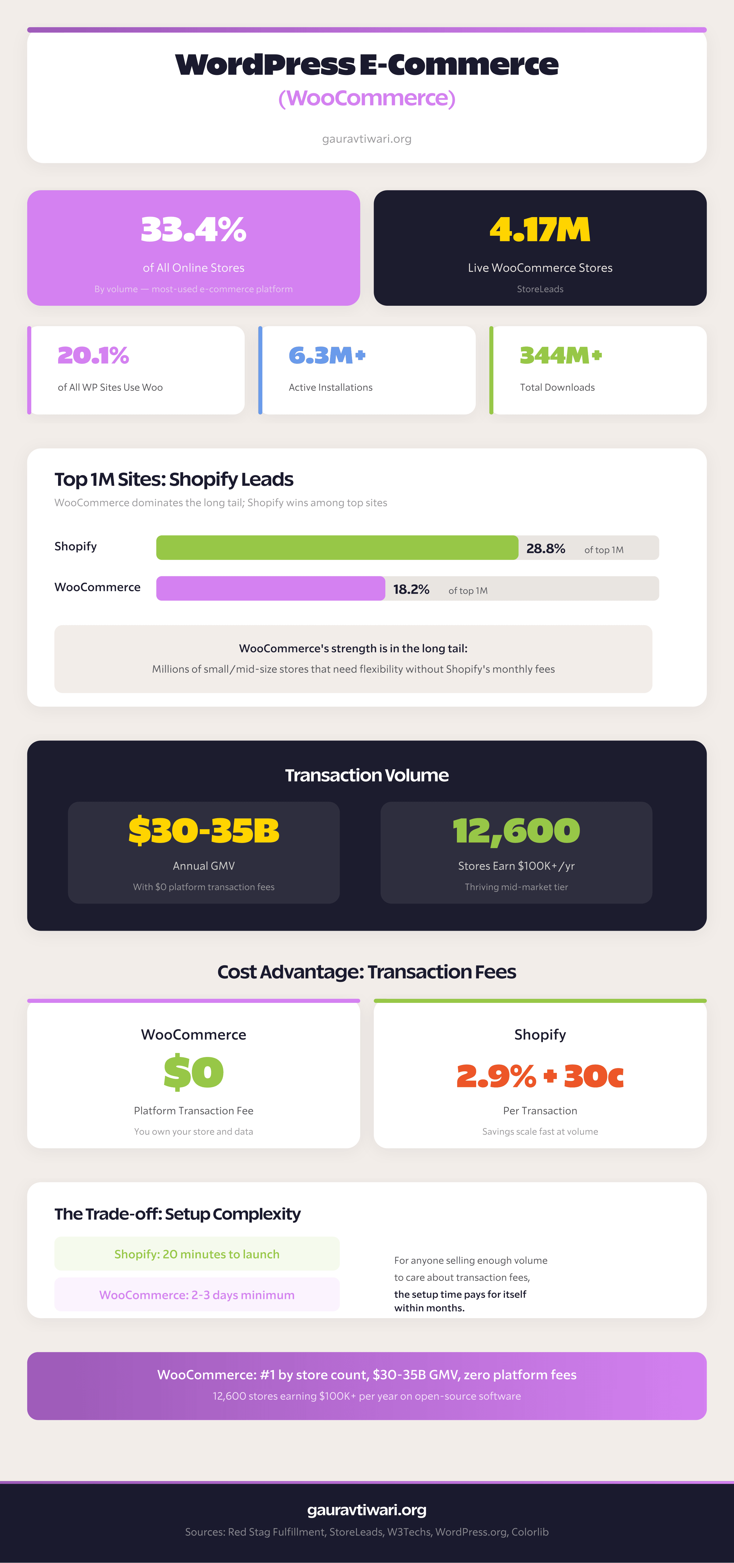 WooCommerce powers 33.4% of all online stores by volume, making it the most-used e-commerce platform globally. There are 4.17 million live WooCommerce stores worldwide processing an estimated $30-35 billion in annual gross merchandise value.