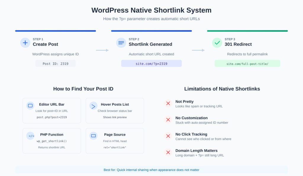 WordPress offers native shortlinks via the ?p= parameter and URL guessing through partial slug matching. These are free and work without plugins, but they’re limited.