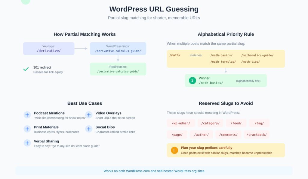 WordPress can match partial slugs to full URLs. If you type site.com/derivative/ and you have a post with the slug /derivative-calculus-guide/, WordPress will redirect to the full URL. When multiple posts match the same partial slug, WordPress picks alphabetically. This feature works on both WordPress.com and self-hosted sites.