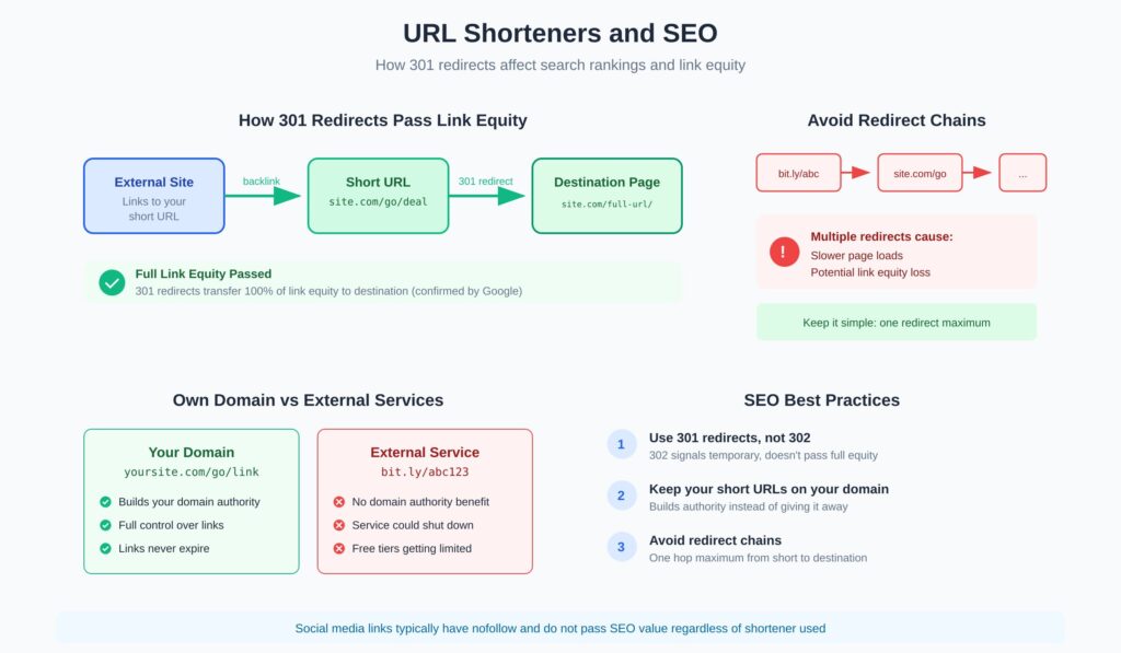 The caveat: the shortener must function correctly. If a service uses 302 redirects (temporary) or JavaScript redirects, that’s a problem. Stick with established services and plugins that use proper 301s.