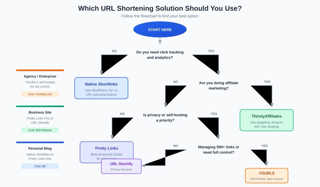 For most WordPress users, a plugin like Pretty Links (free) provides the best balance of features and simplicity. Create branded short URLs on your own domain with click tracking.