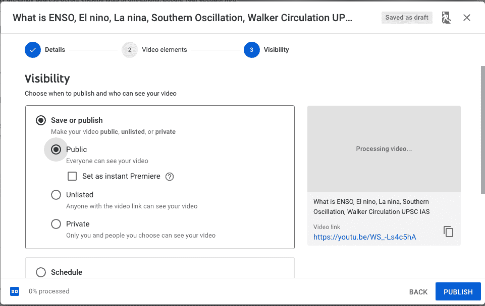 Yet, the main difference between the two can be seen in the scheduling domain. If you at some point want to make your Private video public, you can do it by scheduling it for a particular time. You cannot make use of this function with the Unlisted videos. You cannot make the Unlisted videos public, they cannot be scheduled for that.